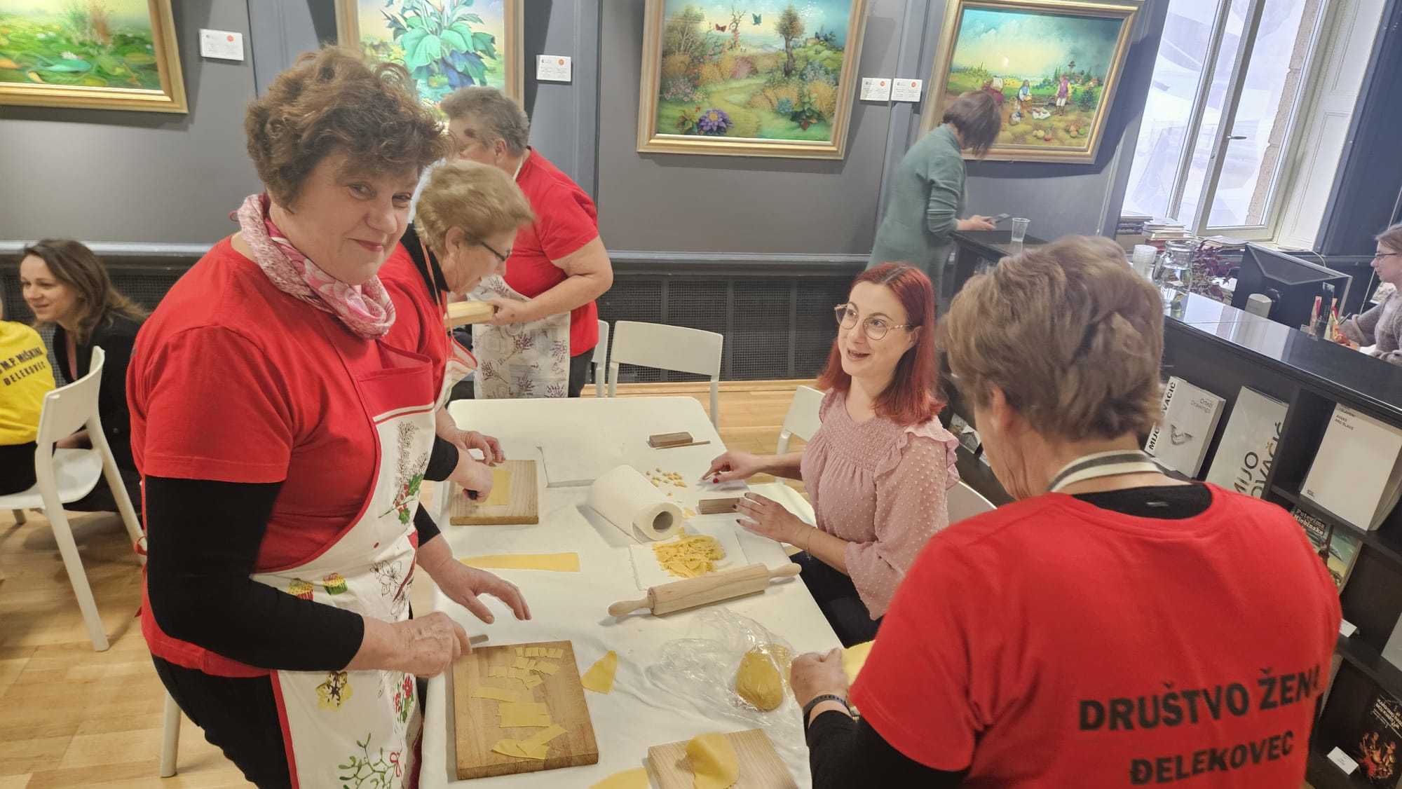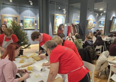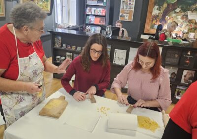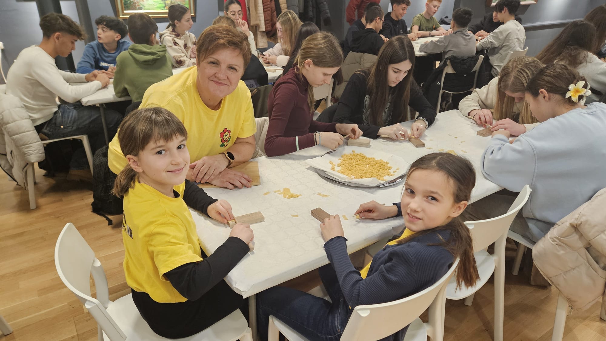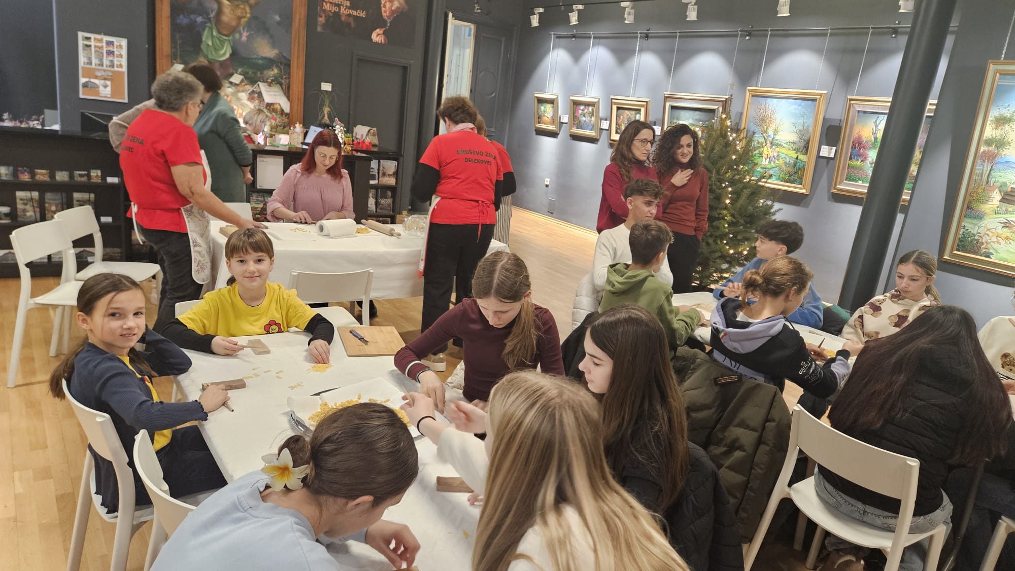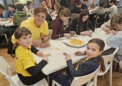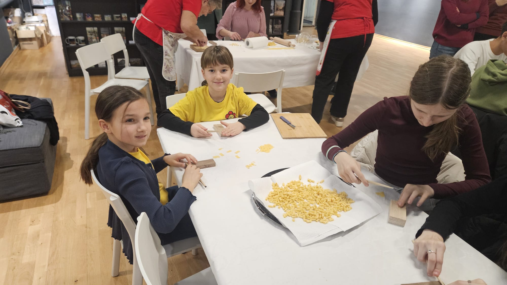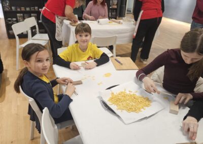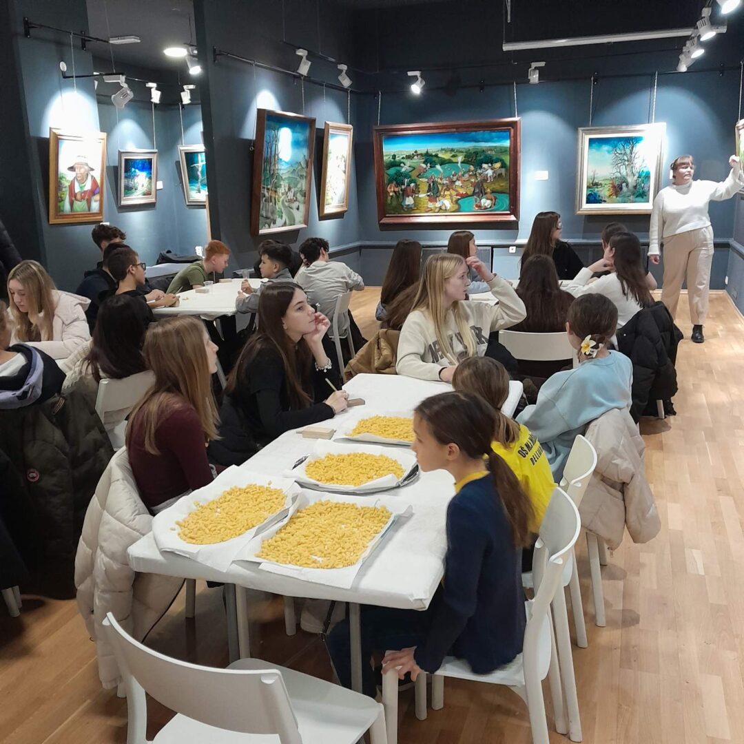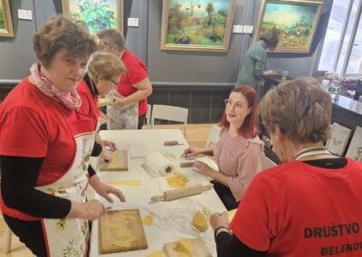 Učenice Mila Gašpar (2.r.) i Anna Marie Pavša (3.r.) sudjelovale su u pokaznoj radionici izrade požiraka s ravnateljicom Sonjom Vuljak i članicama Društva žena u Galeriji Koprivnica. Učenice su pokazale kako vješto izrađuju ovu đelekovečku tjesteninu, a sa zanimanjem su ih pratili i isprobali raditi isto učenici 7.r. iz OŠ Podolice te njihovi vršnjaci iz Italije. Bilo je ovo lijepo druženje i lijepo iskustvo.