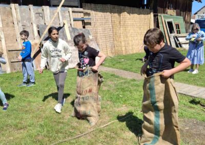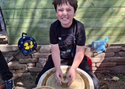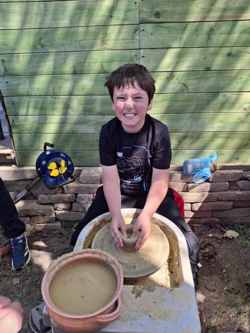Nakon ove dvije radionice  učenici su se okrijepili obilnim ručkom te nastavili rad u još dvije radionice, lončarstvu i pletarstvu. Isprobali su rad na lončarskom kolu te upoznali način pečenja gline i izrade ukrasnih vaza, ćupova, lonaca, ali i crijepova i cigle. Zatim su otišli u obližnji šumarak gdje su uz pomoć majstora pletarstva sami pronašli šibe iz kojih su ispleli plot. Posjet su završili s nekoliko natjecateljskih igara; povlačenje užeta i trčanje u vreći.